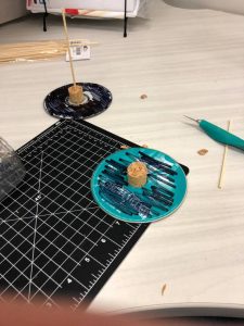 - I glued the cork half onto the middle of the CD to make a wheel. I used the pushpin to make a hole in the middle of the cork. Using the hole made in the cork as a guide I stuck a skewer into two of the wheels. I put those aside to dry.